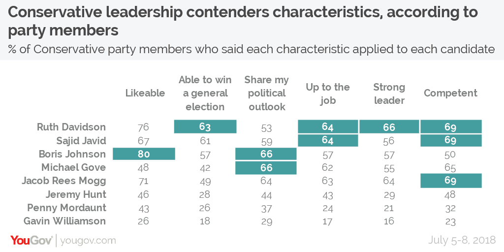 Davidson tops three further lists – “strong leader” (66%), “up to the job” (64%, tied with Sajid Javid) and “able to win a general election” (63%). Sajid Javid ties for top place in two aforementioned categories but wins no others, while Boris tops the tables for “likeable” (80%) and “shares my political outlook” (66%, tied with Michael Gove).