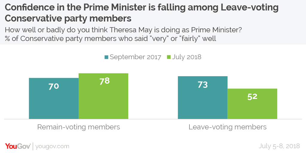 A new YouGov survey indicates that the Prime Minister’s handling of Brexit is losing her support among Tory members who voted for Brexit