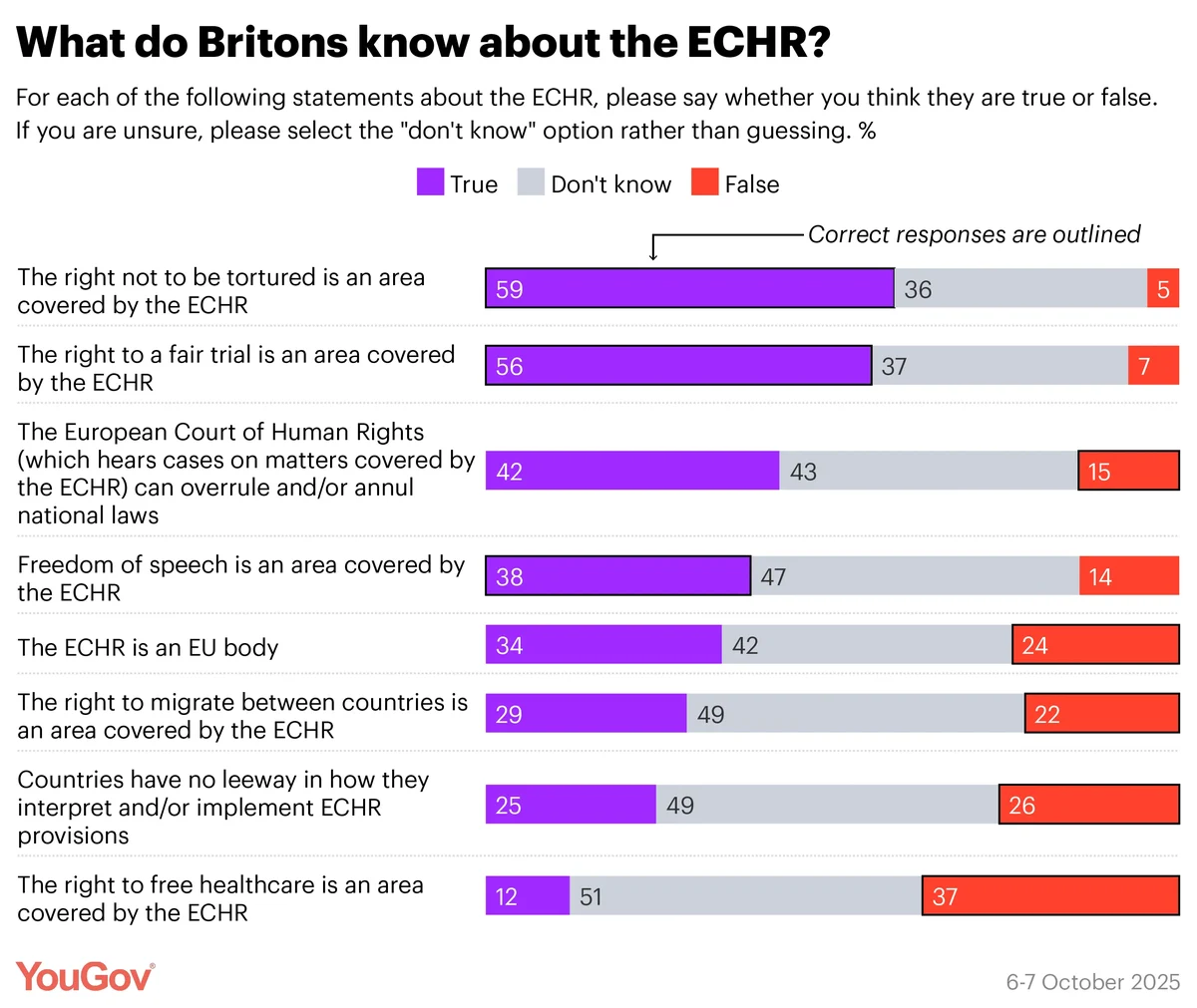 Just 38% know freedom of speech is an area covered by the ECHR, and only 37% know that a right to free healthcare, and 22% the right to migrate, are not.