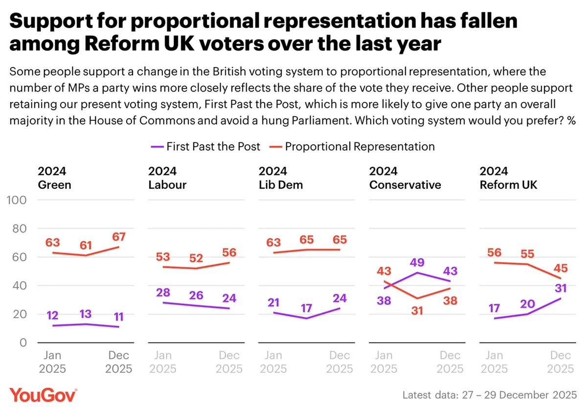 31% of Reform UK voters now back retaining first past the post, up 14 points since January last year