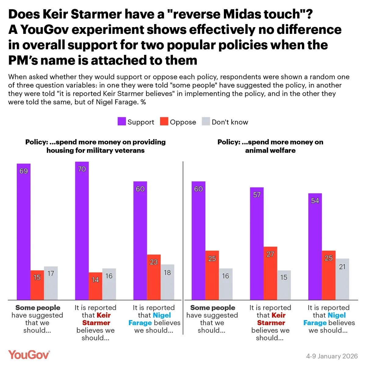 When asked about spending on veterans, support among current Labour voters jumped from 63% in the control wording to 72% when told Starmer believes in the policy; likewise, there was a similar boost among Liberal Democrats. This effect was less present when asked about animal welfare spending, though there was a drop in support among current Reform voters for the policy.