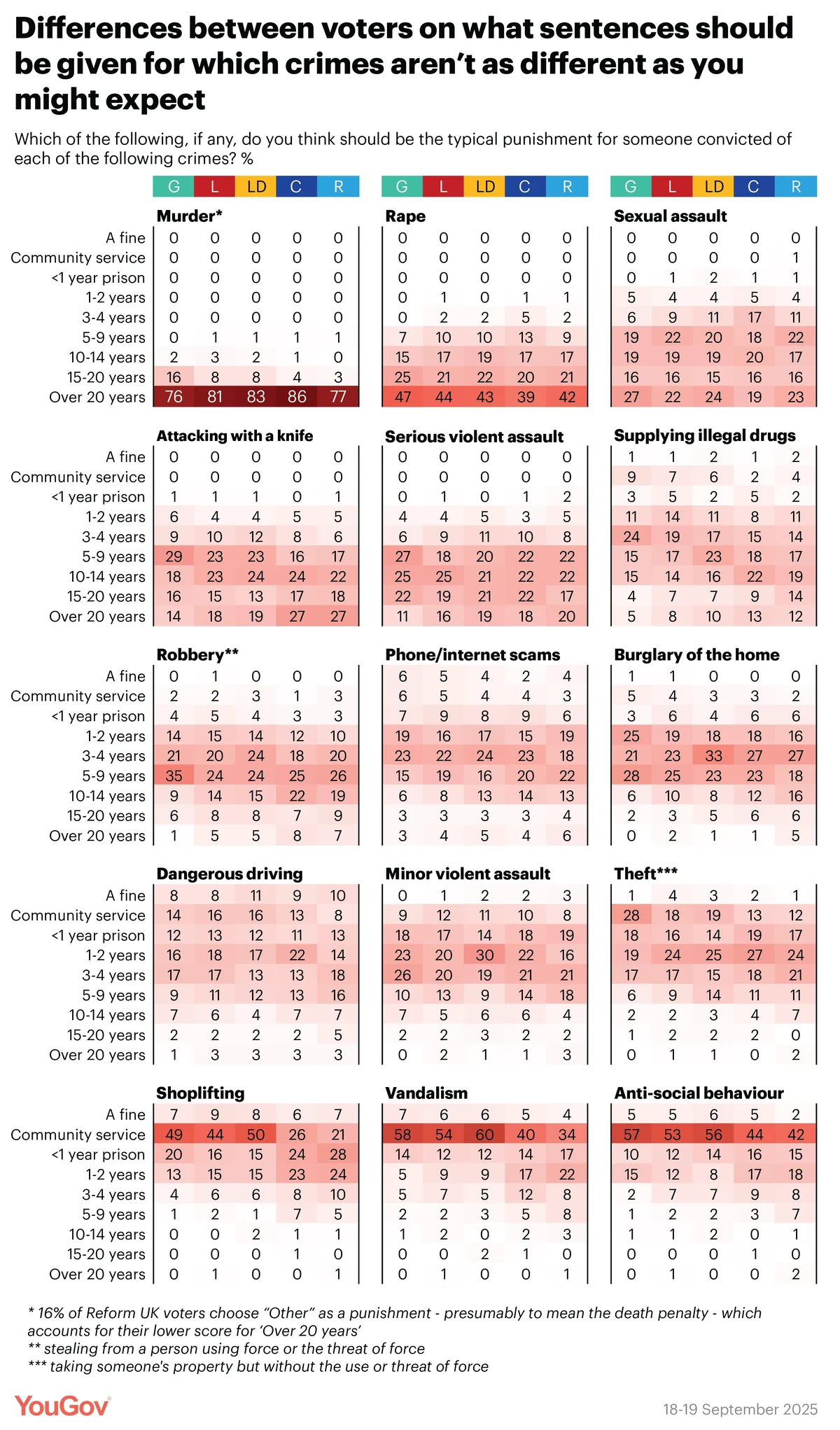 Readers might be surprised to find that the length of prison sentences different voting groups offer for the various crimes do not differ as much as you might think – although there is still an underlying trend of Green voters being the most lenient when it comes to sentences and Tories and Reform voters being the toughest.