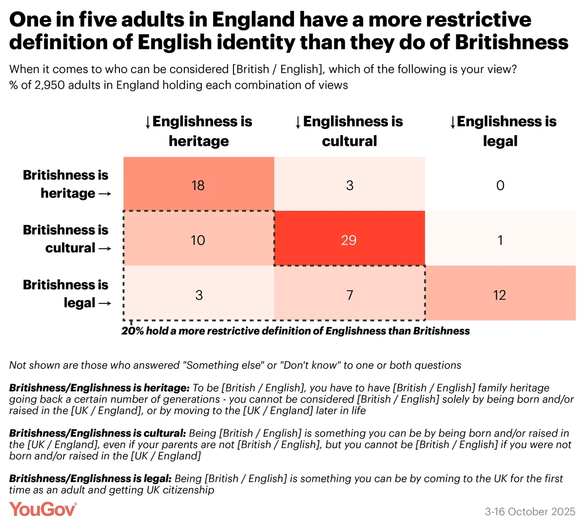 However, one in five English adults (20%) give a more restrictive definition of English identity than they do British identity (i.e. gave the heritage definition for Englishness while giving the cultural or legal definition for Britishness, or gave the cultural definition for Englishness while giving the legal definition for Britishness).
