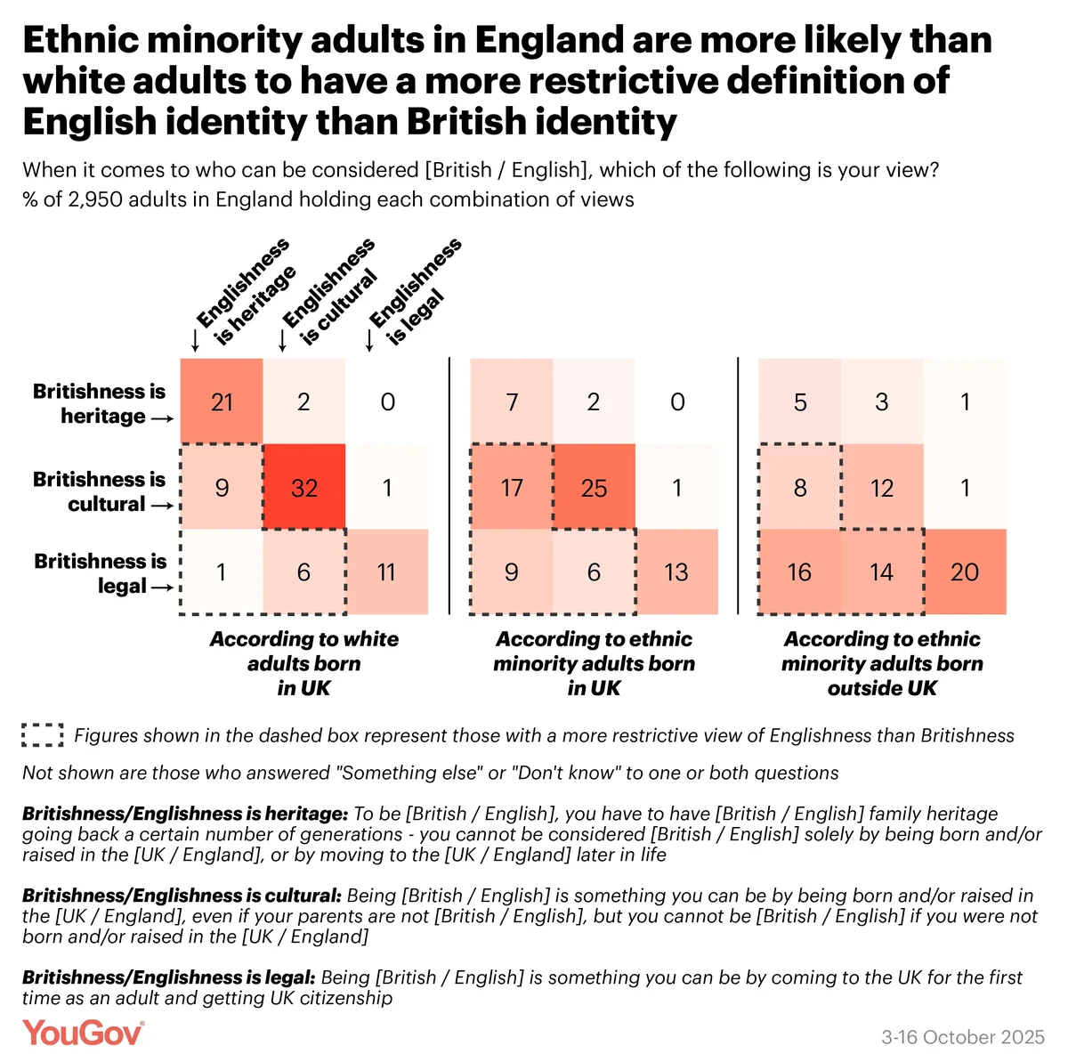 A YouGov study examines how attitudes to British and English identity differ among white and ethnic minority adults in England