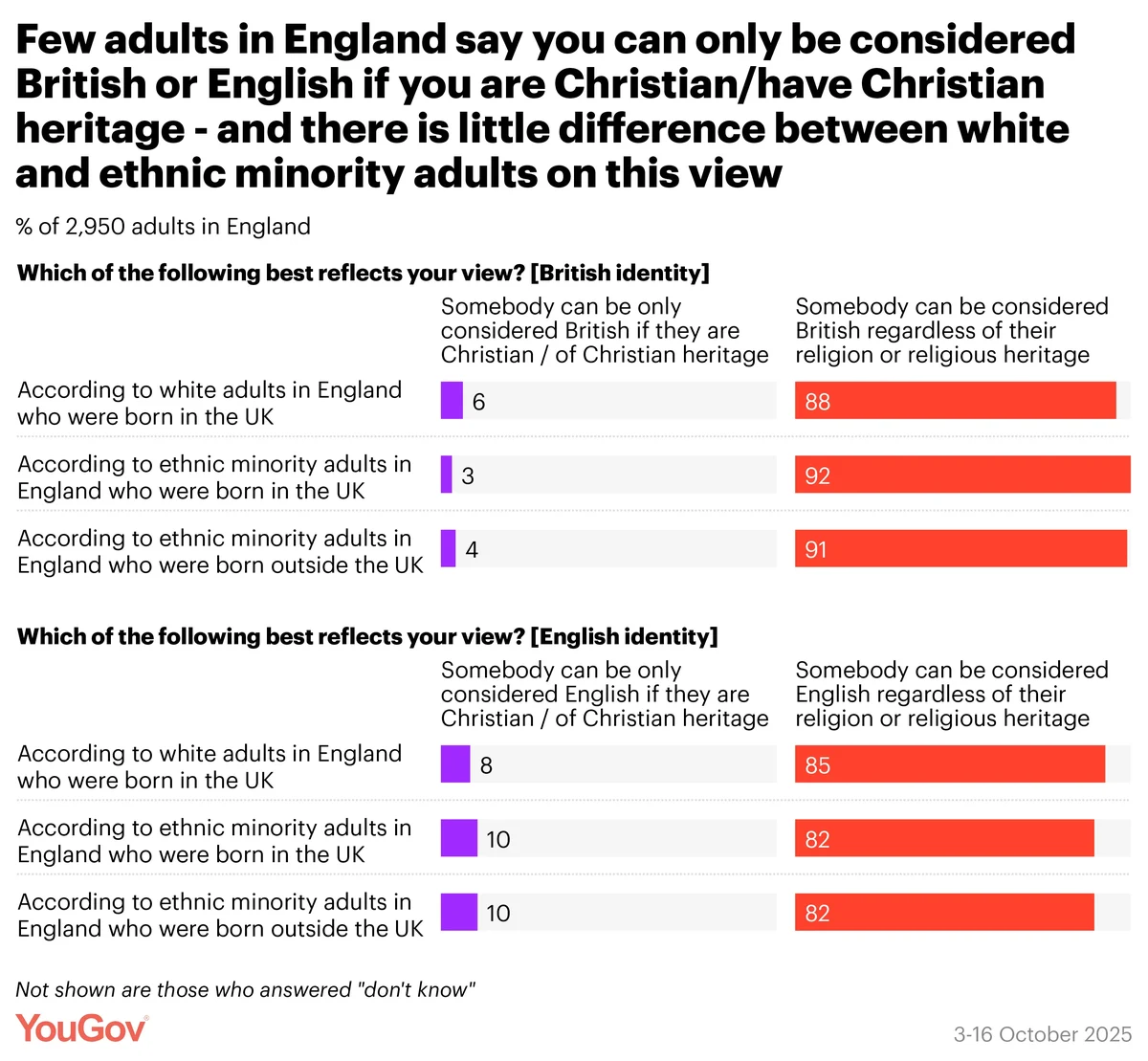 The results show that only 6% believe Britishness requires someone to be Christian or of Christian heritage*, with 9% saying so of Englishness. In both cases, the number of white and ethnic minority adults are about as likely as one another to see things this way.