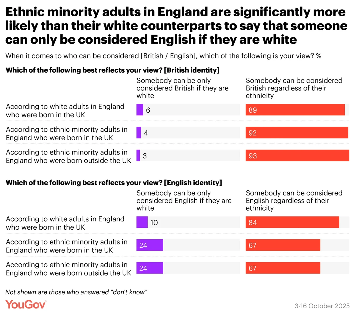 The results show that only 6% of adults in England believe someone can only be considered British if they are white, a figure which is largely similar between white and ethnic minority adults (3-6%).