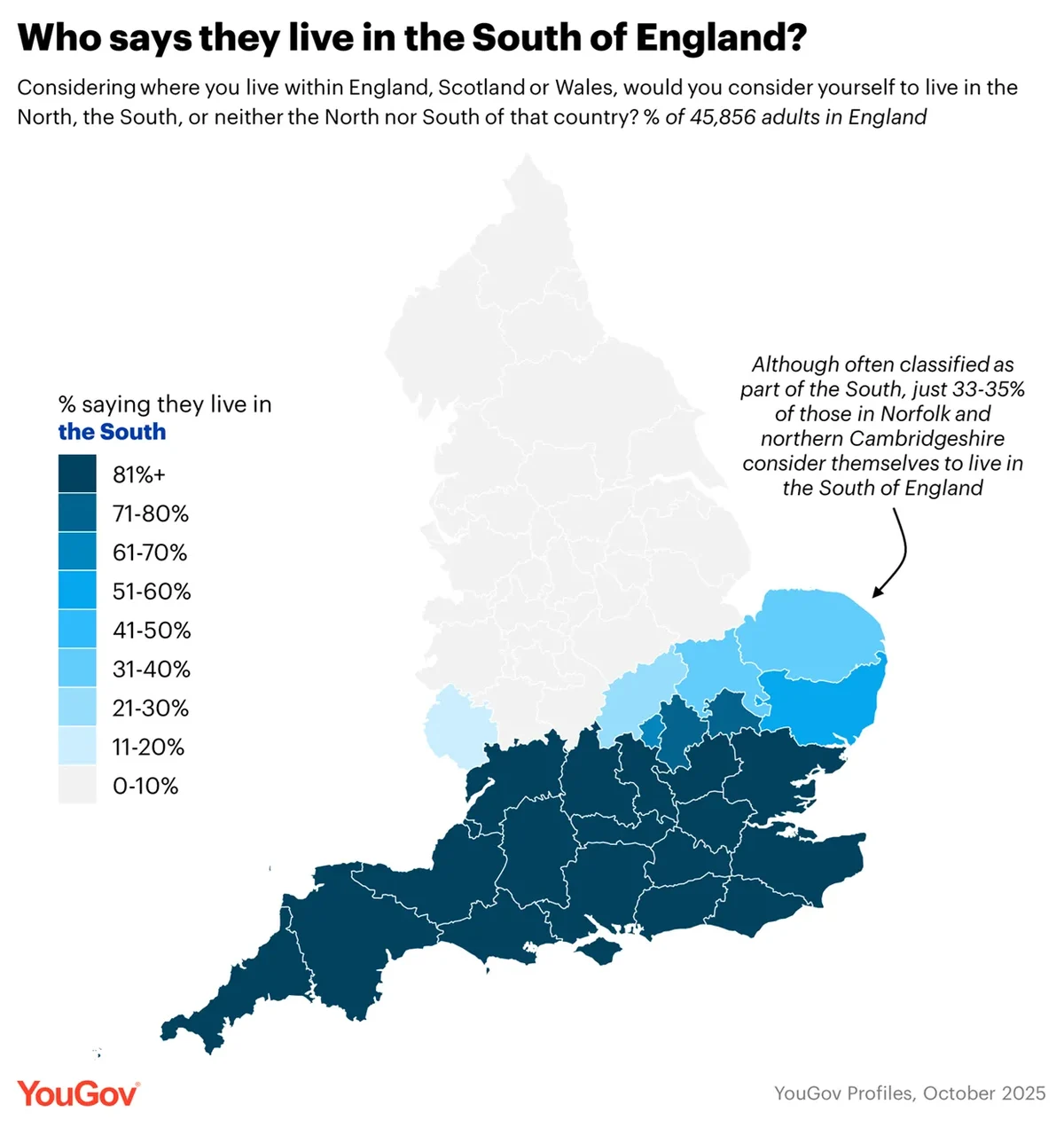 - Just a third of those in Norfolk and northern Cambridgeshire (33-35%) consider themselves to live in the South, despite often being classed as doing so