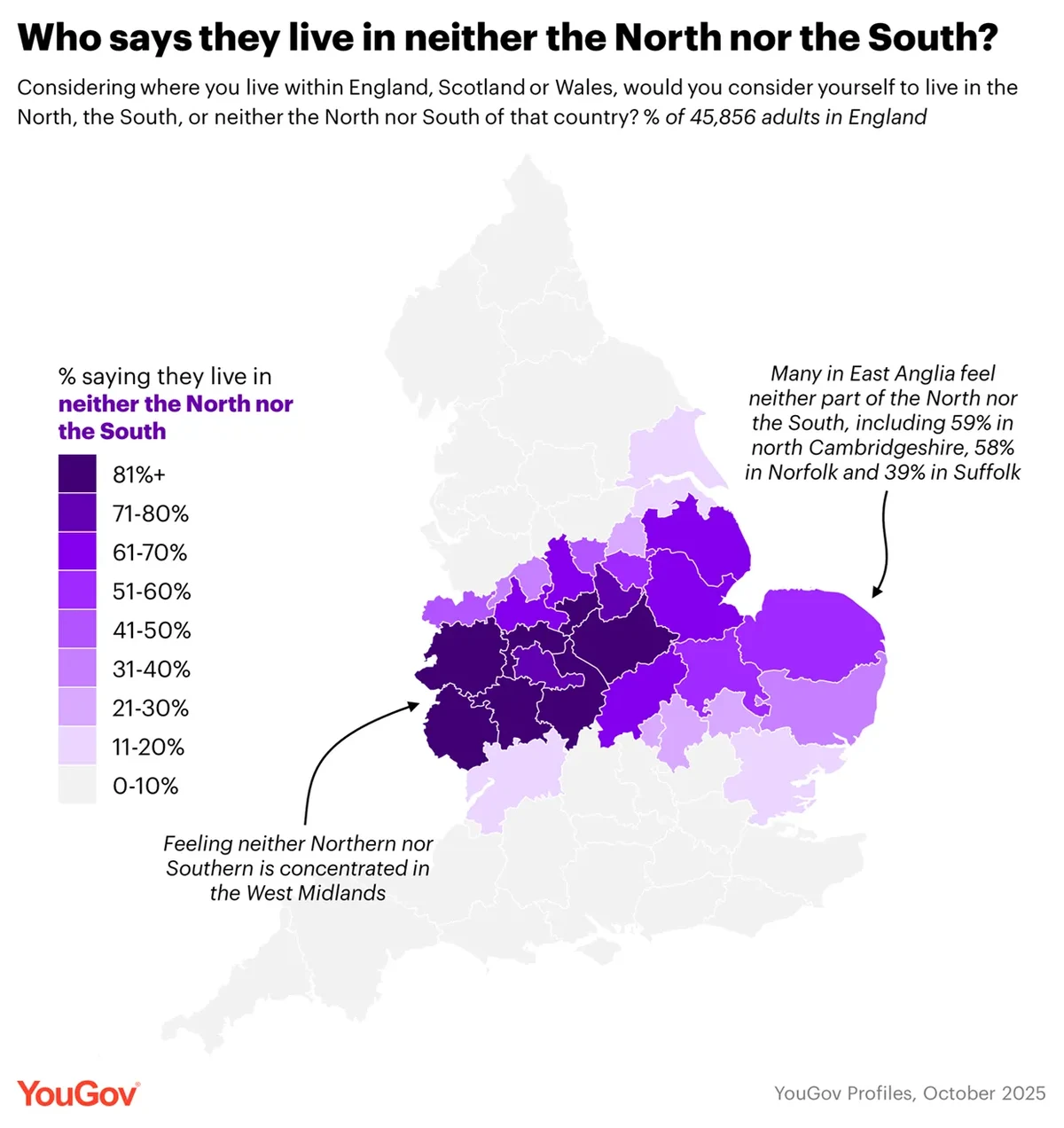 Feelings of Northern-ness extend south of the official border, while parts of East Anglia don’t feel Southern