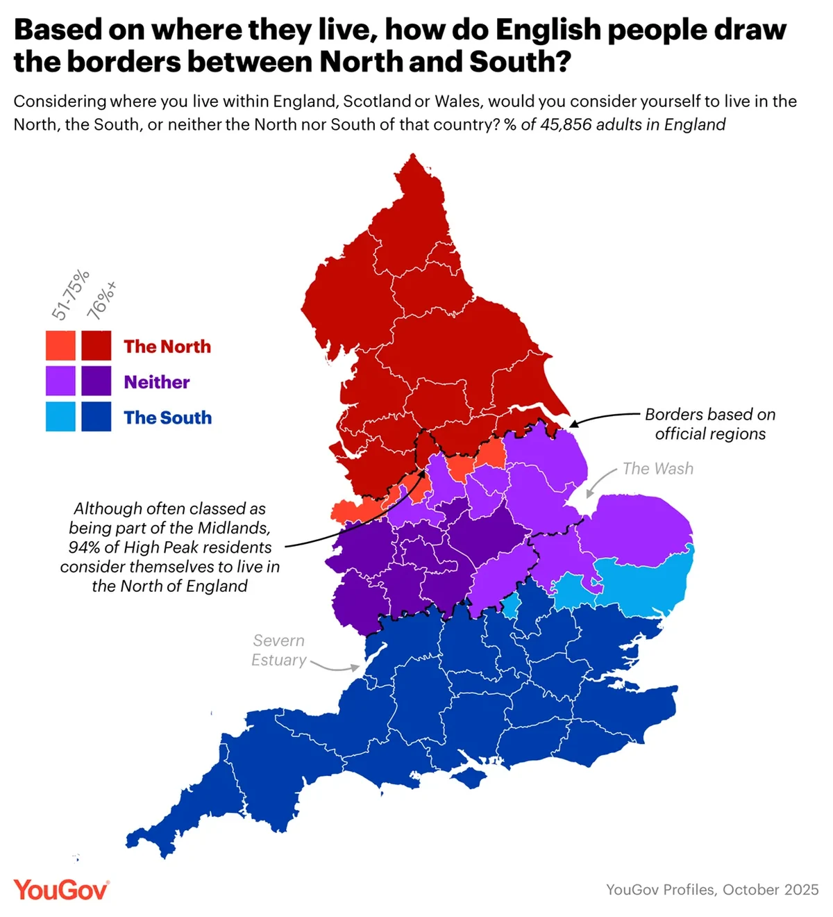 Official groupings usually take the Midlands into account, with “the North” consisting of the North East, North West and Yorkshire and the Humber regions, and “the South” being made up of at least the South East and South West regions. But new YouGov data from nearly 46,000 adults in England reveals that many along the borders don’t place themselves in the same regions as government maps would dictate.