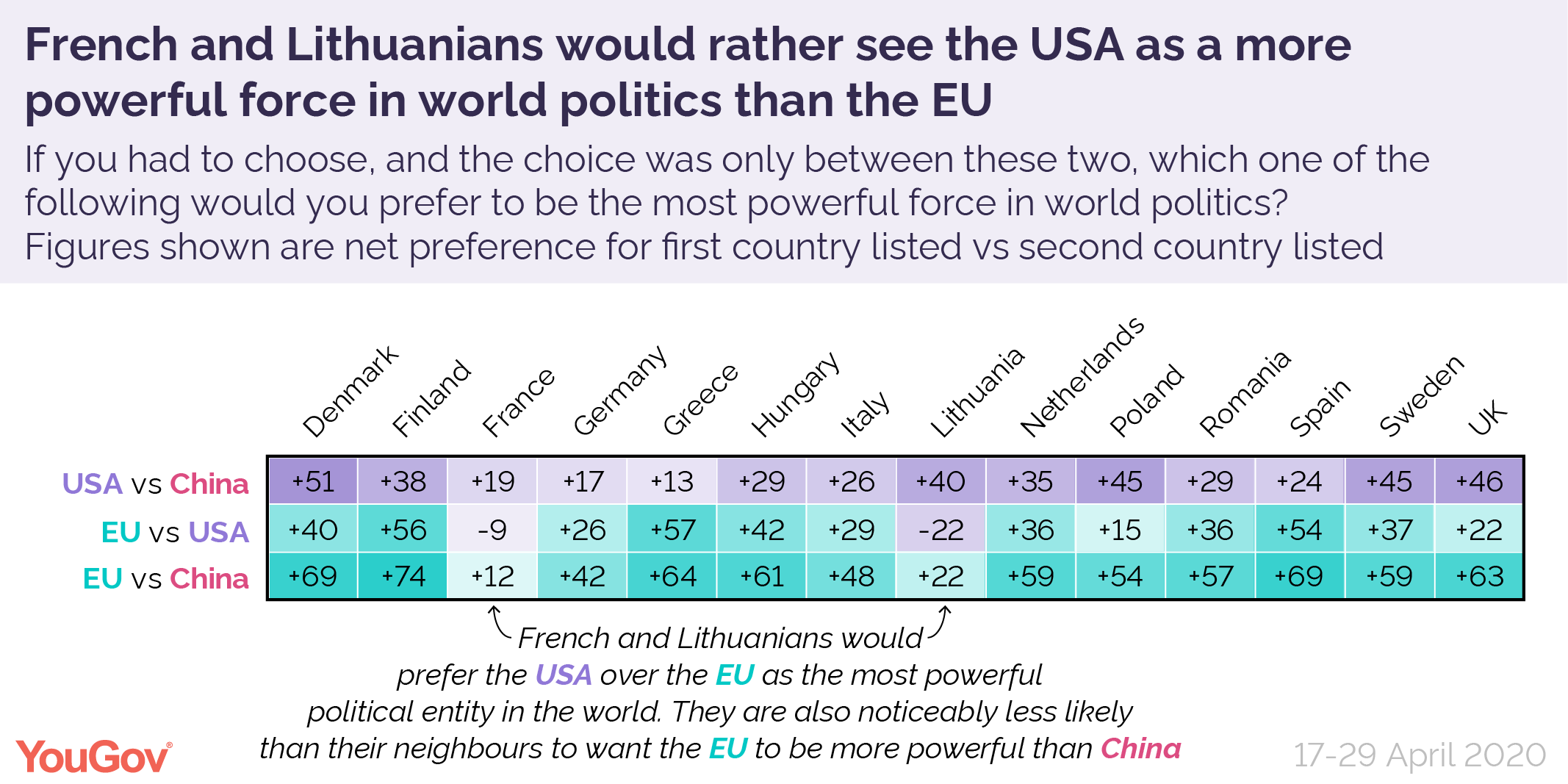 This is generally the case when contrasting the EU and USA, with two exceptions: the French and Lithuanians would prefer the USA to be the more powerful entity.