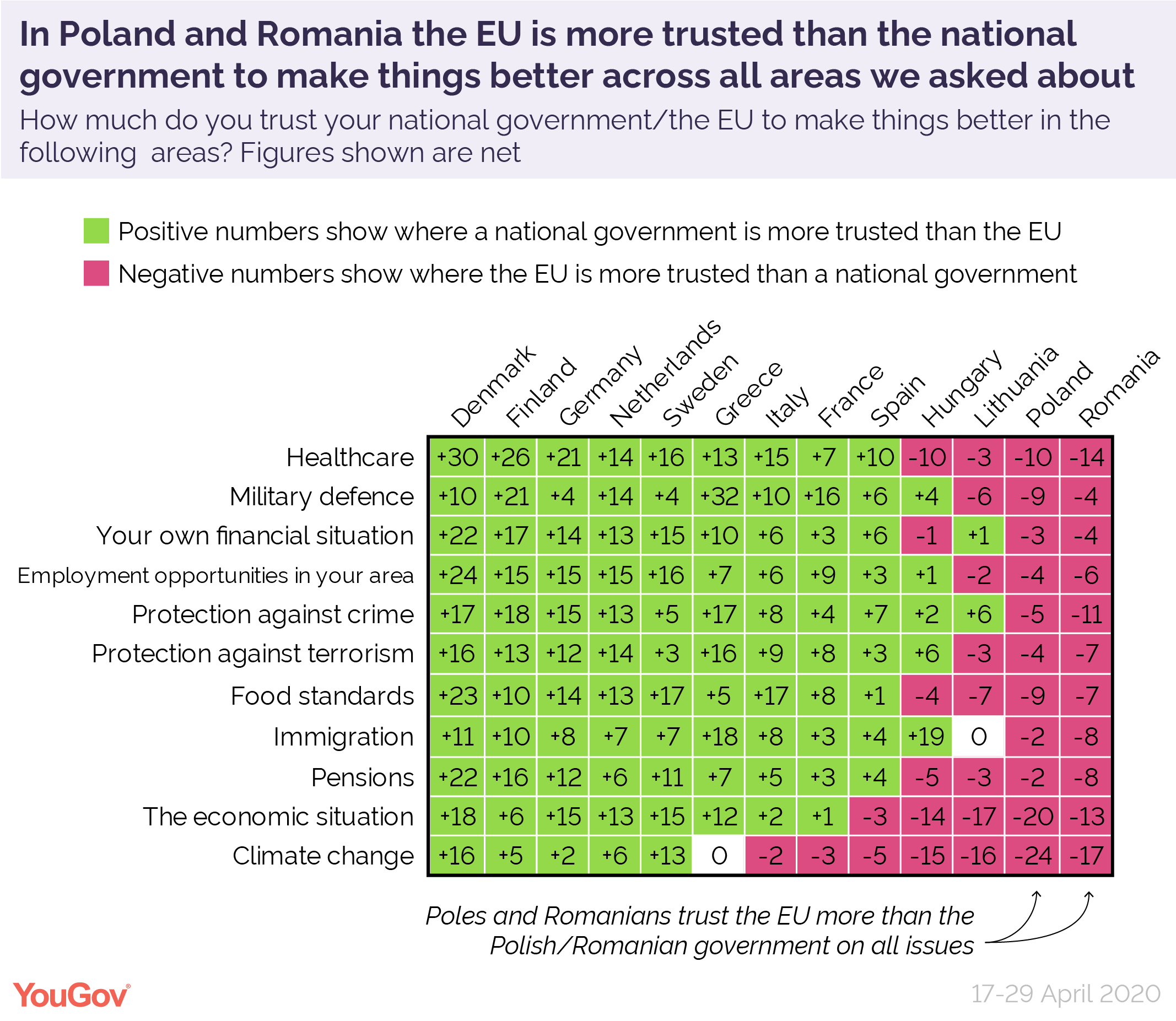 In seven of the 13 EU countries people are more likely to say they trust the EU on climate change than they are to say they trust their national government, with Greeks also exactly tied. This is also the case for five countries when it comes to “the economic situation”.