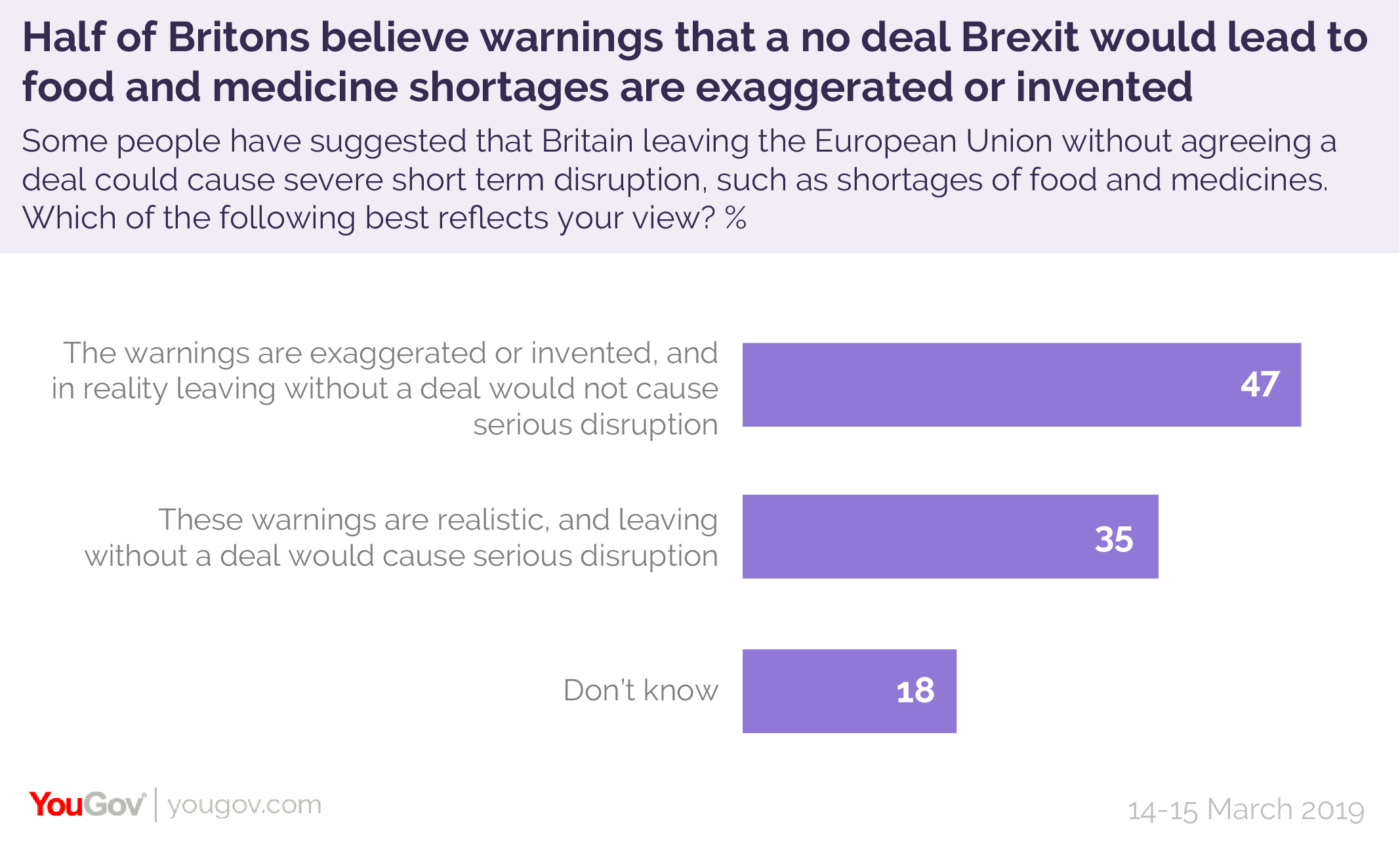 While No Deal is viewed negatively, the majority of people do not believe warnings of severe disruption. Only 35% think the idea of food and medicine shortages is realistic, while 47% think it’s exaggerated or invented.
